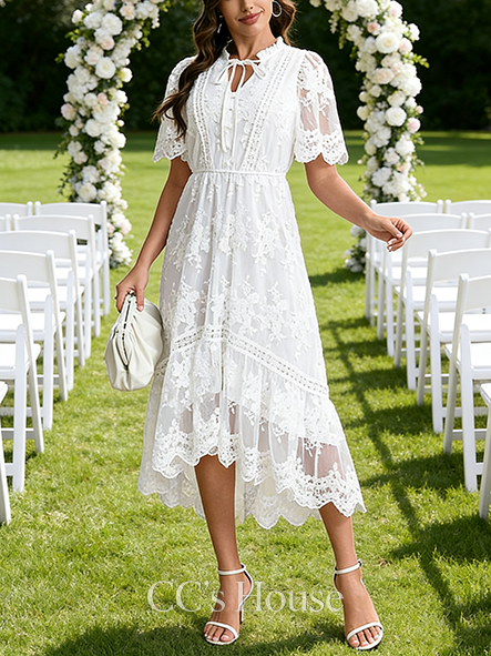 • V-Neck A-Line Bridal Gown - Tea-Length Lace Wedding Dress with Exquisite Embroidered Details