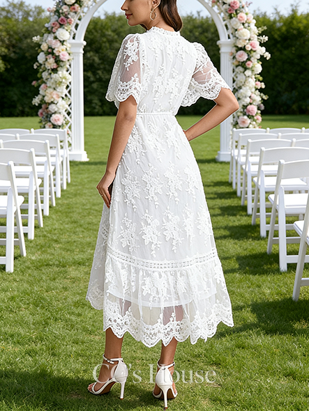 V-Neck A-Line Bridal Gown - Tea-Length Lace Wedding Dress with Exquisite Embroidered Details